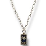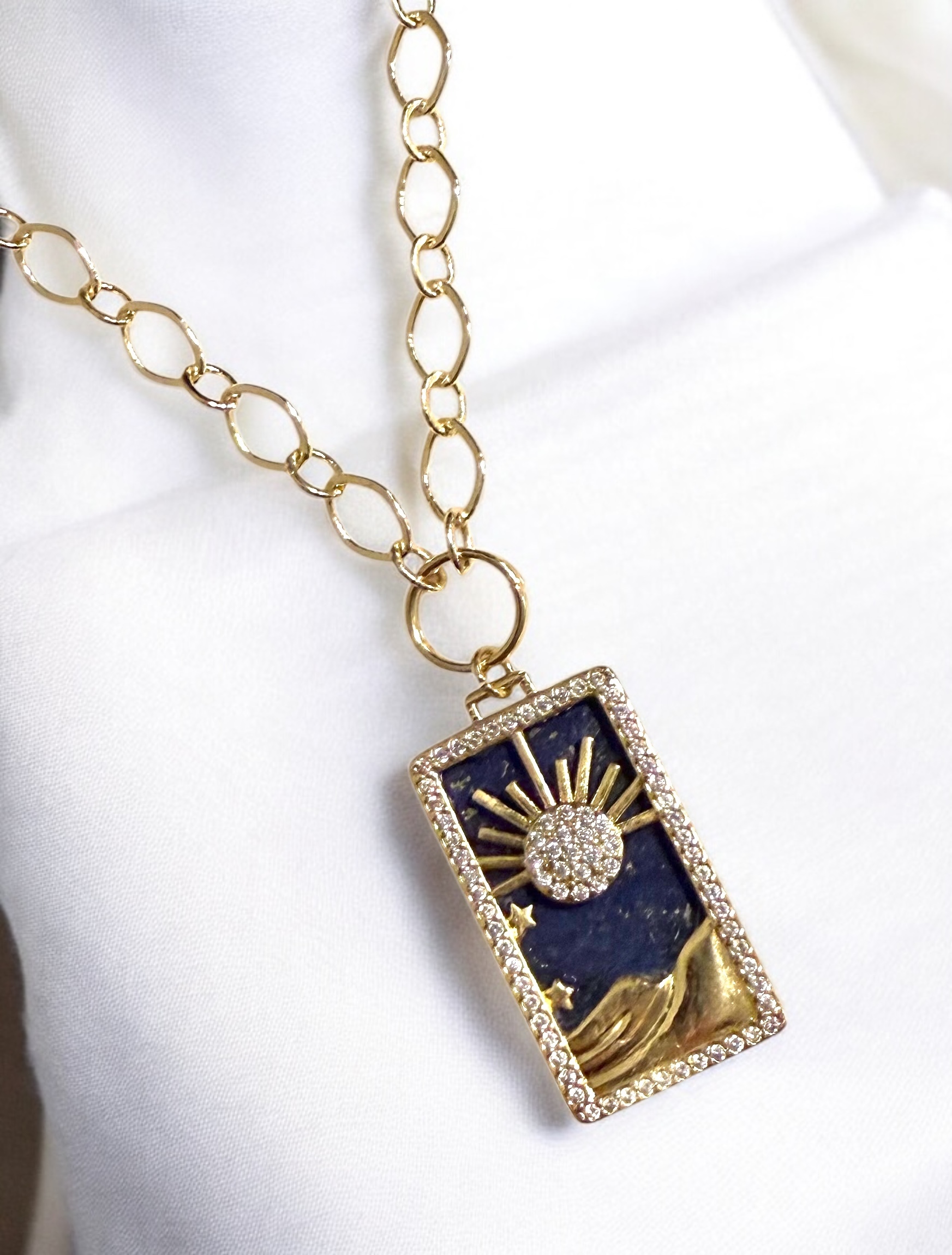 Gold plated oval chain with rising sun pendant. Gold overlay dark blue lapis with mini pave crystal sun.